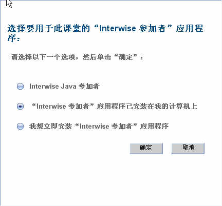 7. 这时会弹出如下的窗口,选择第二项“Interwise参加者应用程序已安装在我的计算机上”,然后点击确定